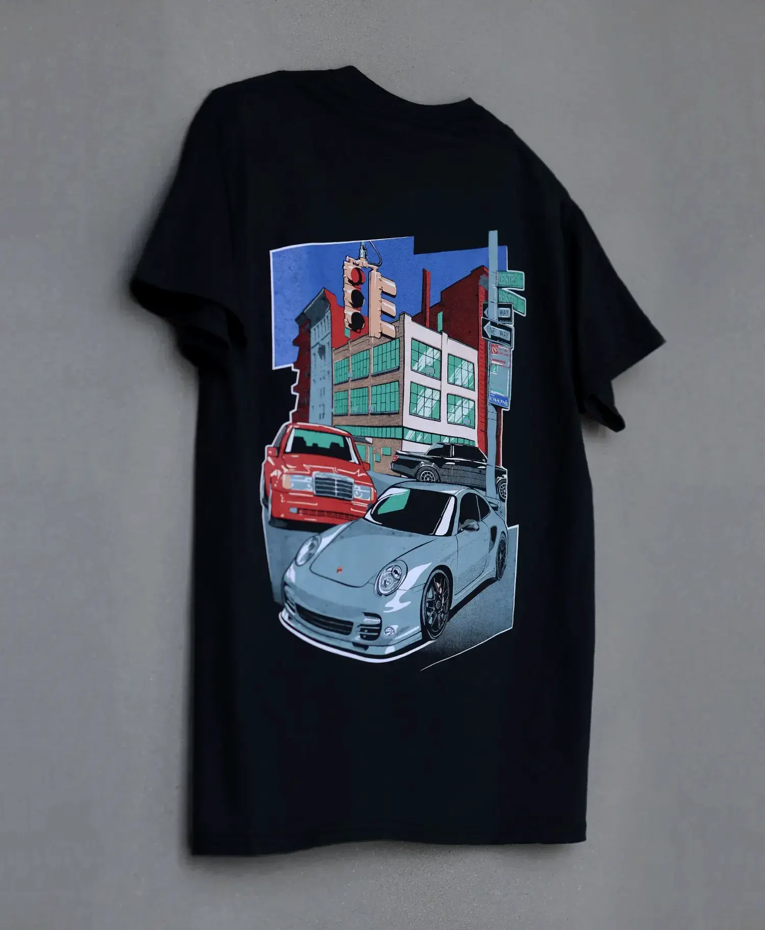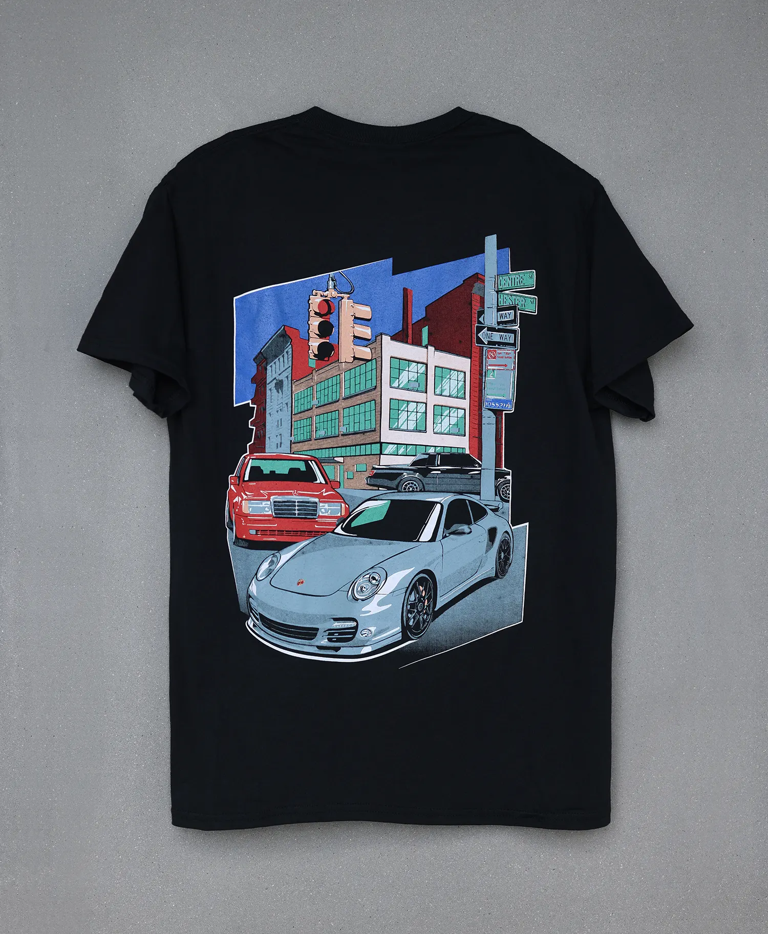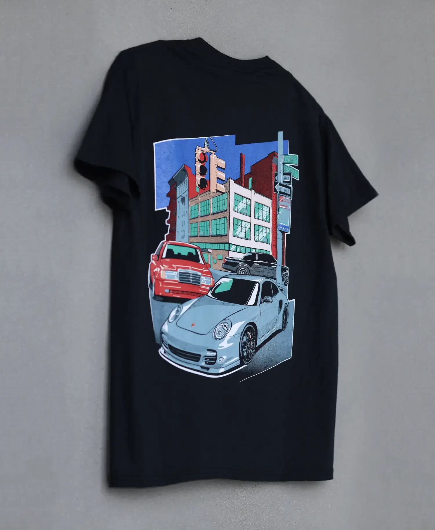 Limited edition T-shirt featuring the original studio building and the founders’ cars.